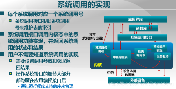 - 系统调用:运行在用户空间的应用程序向操作系统内核请求某些服务的调用过程。是内核提供给应用程序的接口函数,属于系统的一部分。是为了方便应用使用操作系统的接口