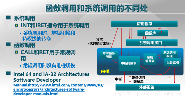 使用的指令不同。系统调用使用INT和IRET,函数调用使用CALL和RET,他们的指令级是完全不同的。具体还有哪些不同呢?我们知道在调用一个函数的时候需要把参数压到堆栈中去,然后转到相应函数去执行,执行的时候从堆栈获取我的参数信息执行,然后返回结果。而对于系统调用来讲,内核是受保护的,为了保护内核,内核与应用程序之间使用不同的堆栈,因此系统调用时会有一个堆栈和特权级的切换,首先切换到内核态,此时可以使用特权指令,并拥有自己的堆栈,执行完后再切换回用户态。而常规调用是没有堆栈切换的。