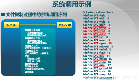 一个文件复制过程可以拆分如下图所示,我们可以先看下整个过程中哪些过程会使用到系统调用:1.键盘输入;2. 屏幕显示;3. 读取文件;4. 创建文件 5. 写入文件。而在操作系统内部,键盘、屏幕与文件都视为文件系统里的,只是键盘、屏幕作为特殊文件来使用。因此用到了右图中标红的系统调用(还有一个creat)。