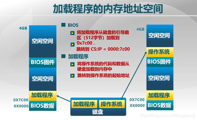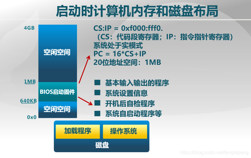 Bootloader:加载OS。操作系统一开始是放在DISK(硬盘)中,并不是放在内存中。
