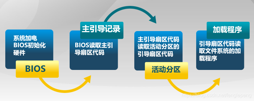 首先是BIOS读取加载程序的过程:系统加电后,CPU初始化,然后BIOS初始化硬件,然后查询主引导记录读取主引导扇区代码,这是由于现代计算机内通常不止有一个分区,不同分区内可能有不同的操作系统,而我们需要知道我们要启动的操作系统在哪个分区内(称为活动分区),这就是通过读取主引导记录实现的。知道活动分区之后将活动分区引导扇区内的代码读取到内存并执行,引导扇区内的代码读取文件系统的加载程序。这才是较为完整的读取加载程序的过程。