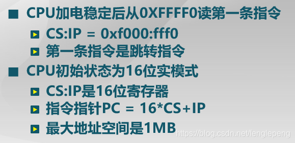 那么再详细一点讲,计算机上电后,首先是CPU初始化:CPU上电后,通过CS、IP两个寄存器知道从0XFFFF0地址读取第一条指令,这条指令是跳转指令,跳转到BIOS程序段。为什么是0XFFFF0呢,这是因为CPU上电后会初始化CS:IP = 0xf000:fff0。并且CPU初始化后处于实模式,也就是16位系统,20位寻址空间,是通过将CS左移4位与IP相加得到最终的地址因此指令指针PC = 16*CS+IP。20位寻址空间自然意味着最大寻址空间为2^20byte,即1M。