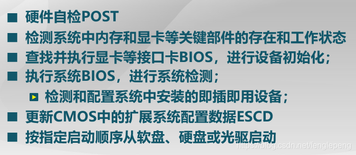 接下来是BIOS初始化:硬件自检(ROM等);检测内存(RAM)、显卡等关键部件是否存在,存在的话工作状态是否正常;查找并执行显卡等接口卡的BIOS(显卡等拥有自己的BIOS固件),对设备进行初始化;之后执行系统BIOS进行系统检测,主要是为了检测计算机有哪些即插即用设备,比如硬盘、光驱或者U盘;检查完之后更新CMOS中的扩展系统配置数据(ESCD)告知有哪些即插即用设备;之后就可以按照指定的启动顺序从软盘、硬盘或者光驱启动操作系统。