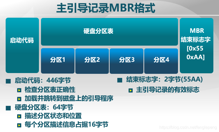 BIOS初始化完了,自然是要读取主引导记录。主引导记录(MBR)的格式如下图:启动代码限制为446字节以内,用于检查分区表的正确性、寻找活动分区并将活动分区引导程序加载到内存;还有64字节用于存储硬盘分区表,描述分区状态和位置,最多表示4个分区,每个分区16字节;还有一个MBR结束标志字(0x55AA),占2字节,只有有这个结束字才认为这条MBR是合法的MBR并执行启动代码。