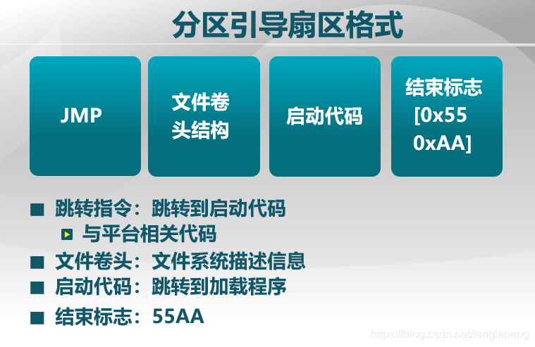 当主引导记录读完并正确执行启动代码后,活动分区引导扇区的内容就被读入内存,分区引导扇区格式如下图:首先是跳转指令,这条跳转指令是与平台相关的,CPU不同则跳转指令不同,跳转至启动代码处;文件卷头结构则记录文件系统描述信息;结束标志也是0X55AA;启动代码则负责跳转到加载程序,加载程序不存储在引导扇区,而是存储在磁盘中,只要在启动代码中记录加载程序的位置即可。