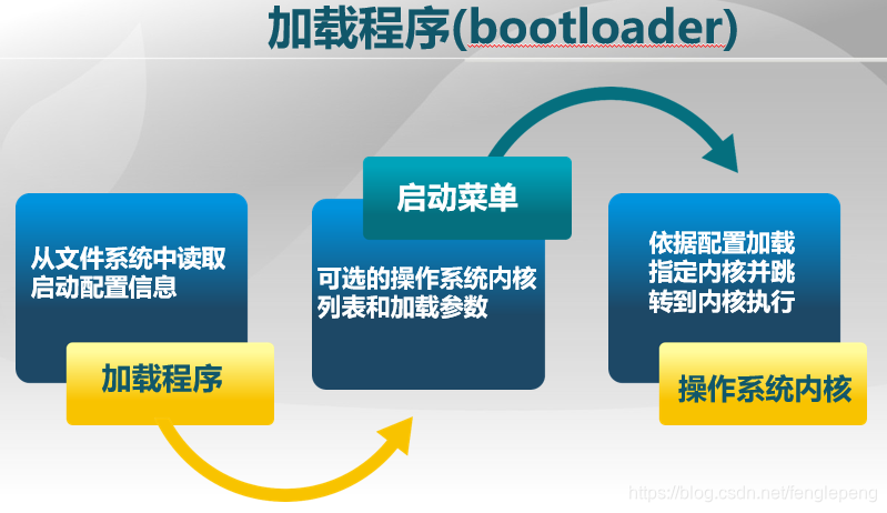 活动分区引导扇区将加载程序读入内存之后,加载程序的执行状态如下图:加载程序并不是直接读取操作系统内核,而是从文件系统中读取启动配置信息;依据配置信息(不同的内核有不同的配置信息),确定启动的内核或启动参数(比如是安全模式启动还是正常模式启动);最后根据配置加载指定内核并转到内核执行,此时将控制权转移给了操作系统内核。