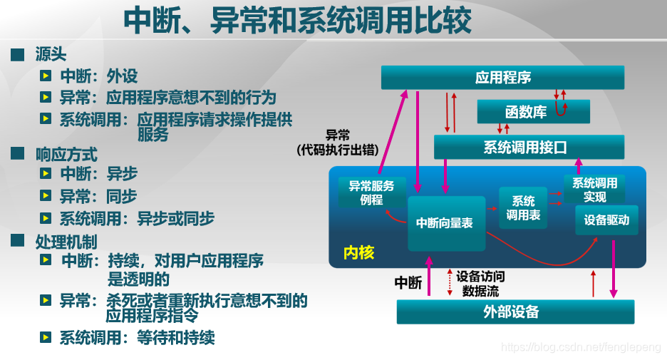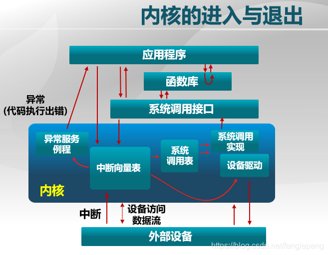 中断、异常与系统调用的结构图如下图:当有外部设备接入或者有输入,则告知内核(插入中断向量表),内核通过设备驱动与外部设备交互;当应用程序执行过程中出现异常,也插入中断向量表,内核要么将异常解决掉,要么终止程序,并将程序占用的资源返还;应用程序可以直接或者通过函数库间接地使用系统调用接口,插入中断向量表,中断向量表通过查询系统调用表提供系统调用实现,并将结果返还。因此可以说内核与外界打交道的接口主要就是中断、异常与系统调用。