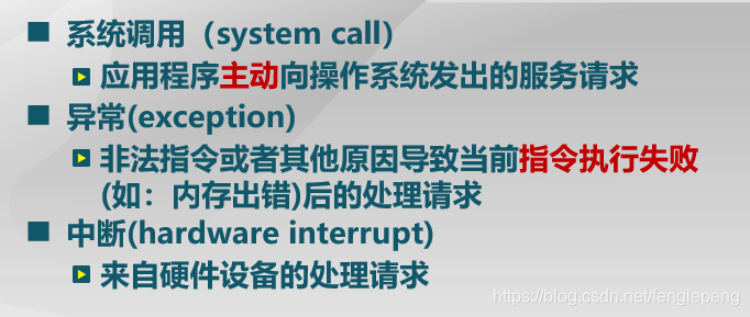 从上图也可以看到中断、异常与系统调用的区别如下图:系统调用是应用程序主动向操作系统发出的服务请求;异常是非法指令或其他原因导致当前指令执行失败(如内存出错)后的处理请求;中断则是来自硬件设备的处理请求。
