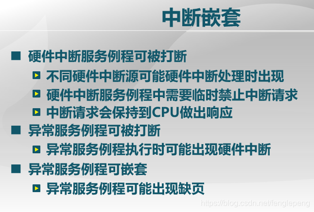 那么如果一个中断出现的时候又出现新的中断会怎样呢(此处中断指中断处理机制即包含中断、异常、系统调用三者)?其中,硬件终端服务例程可以被打断,比如不同硬件中断源同时出现,此时可以按照优先级依次处理,而出现了非常重要的中断比如电源出现问题时,则可以临时禁止接收中断请求,而被接收了的中断请求会保持到CPU对中断做出响应。异常服务例程也是可以被打断的,比如异常执行中可能出现硬件中断,例如处理异常时进行磁盘IO,此时磁盘出现了硬件中断,则会打盹异常服务例程去进行硬件中断处理。异常服务例程也是可以嵌套的,比如处理异常时又出现了缺页异常,此时则会产生嵌套。