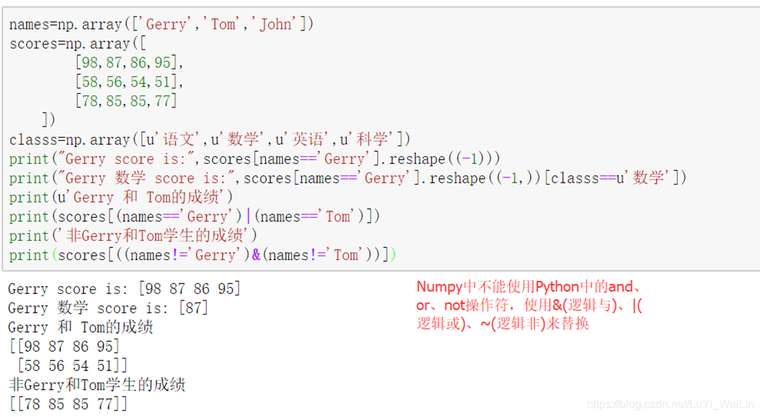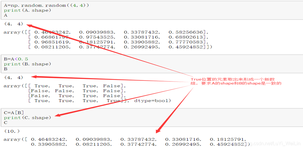 | logical_and、logical_or、 logical_xor | 执行元素级别的布尔逻辑运算,相当于中缀运算符&、|、^ | np.logical_and(arr1,arr2) np.logical_or(arr1,arr2) np.logical_xor(arr1,arr2) |