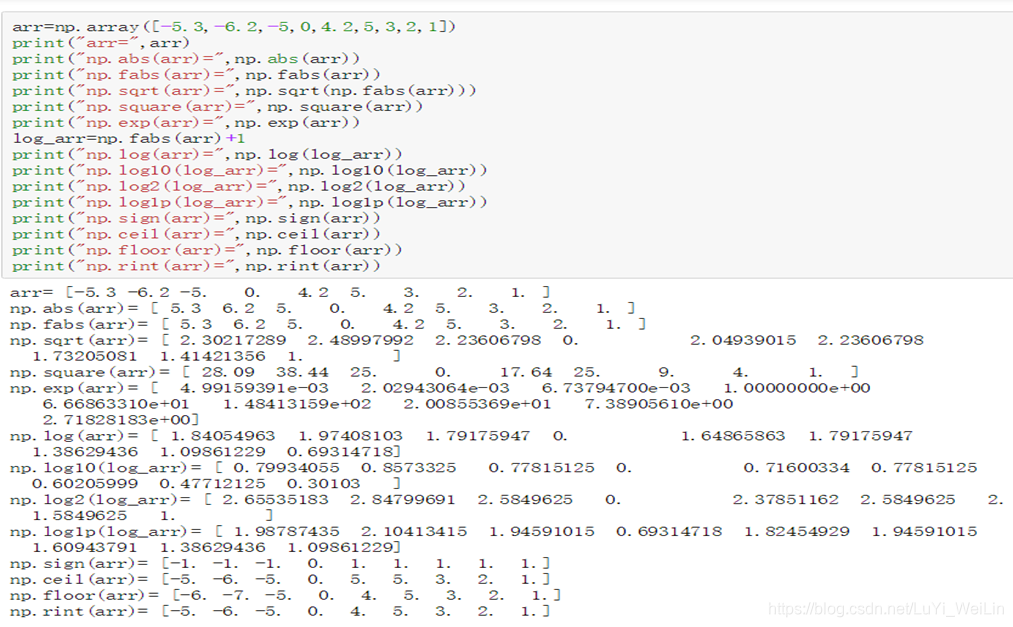 | log、log10、 log2、log1p | 分别计算自然对数、底数为10的log、底数为2的log以及log(1+x);要求arr中的每个元素必须为正数 | np.log(arr) np.log10(arr) np.log2(arr) np.log1p(arr) |