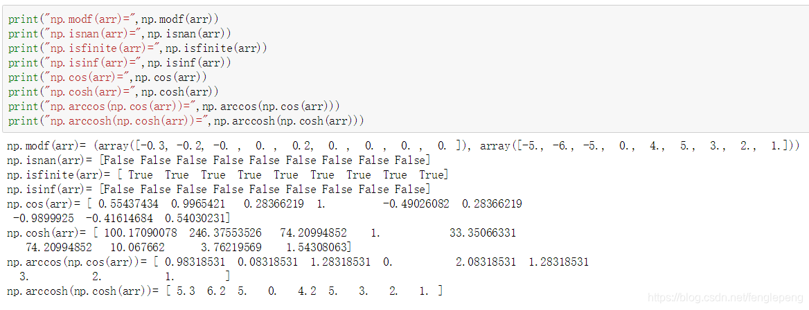 | cos、cosh、sin、 sinh、tan、tanh | 普通以及双曲型三角函数 | np.cos(arr) np.sin(arr) np.tan(arr) |