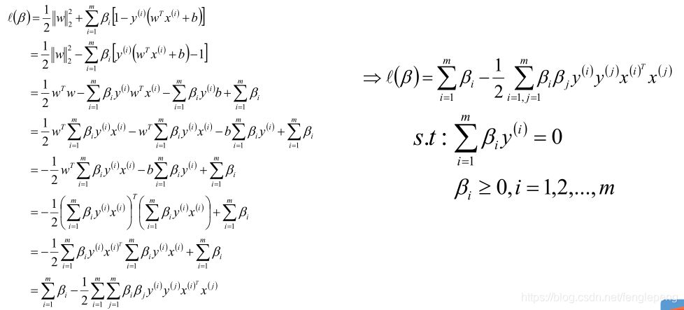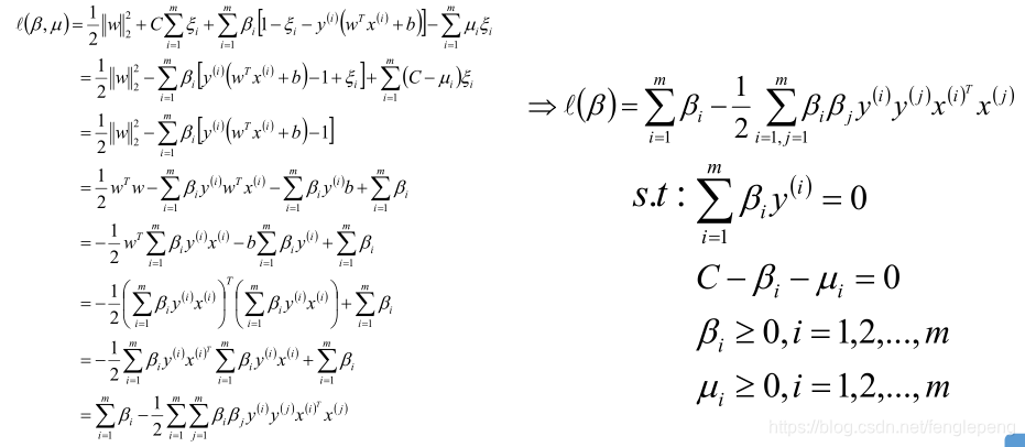 将w、b、ξ的值带入函数L中,就可以将L转换为只包含β的函数,从而我们可以得到最终的优化目标函数为(备注:对于β的求解照样可以使用SMO算法来求解):