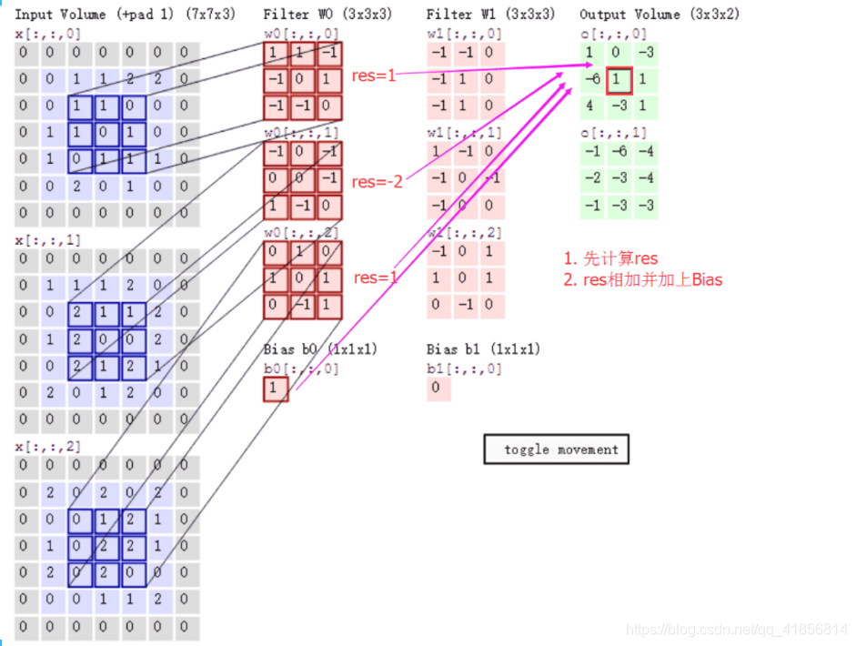 计算步骤解释如下,原图大小为7*7,通道数为3:,卷积核大小为3*3,Input Volume中的蓝色方框和Filter W0中红色方框的对应位置元素相乘再求和得到res(即,下图中的步骤1.res的计算),再把res和Bias b0进行相加(即,下图中的步骤2),得到最终的Output Volume