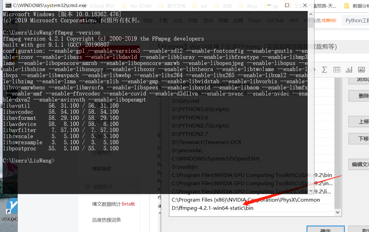 之后为了测试FFmpeg是否安装成功,打开cmd输入:ffmpeg -version 如果出现如下图中出现的信息说明安装成功。