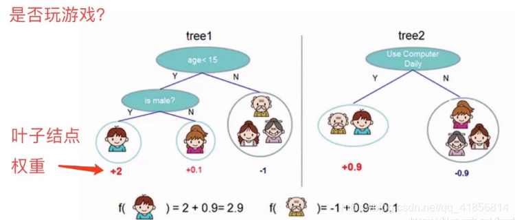 看上面一个图例左边:有5个样本,现在想看下这5个人愿不愿意去玩游戏,这5个人现在都分到了叶子结点里面,对不同的叶子结点分配不同的权重项,正数代表这个人愿意去玩游戏,负数代表这个人不愿意去玩游戏。所以我们可以通过叶子结点和权值的结合,来综合的评判当前这个人到底是愿意还是不愿意去玩游戏。上面「tree1」那个小男孩它所处的叶子结点的权值是+2(可以理解为得分)。