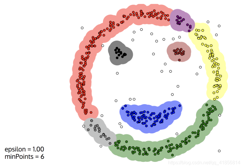 如果minPoints参数设置再大一点,那么这个笑脸可能会更好看。没有颜色标注的就是圈不到的样本点,也就是离群点,DBSCAN聚类算法在检测离群点的任务上也有较好的效果。
