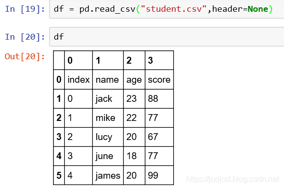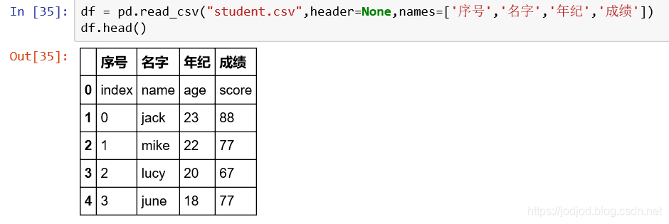 3、若不希望第一行作为标题,或者在read_csv()中添加参数header=None