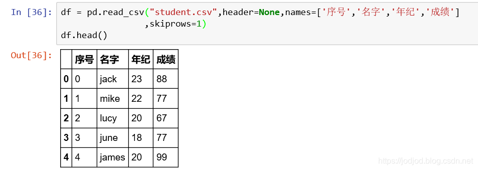 上例中原标题也被读取出来了,通过参数skiprows可以跳行