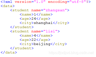 root下有student子标签,student下有name,age,city子标签。同样标签名即为类型名