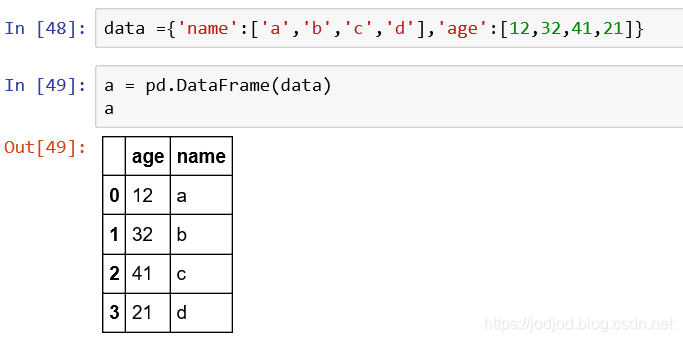 1、传递一个字典对象给DataFrame的构造函数,dict的key为每一列的列名,value作为列元素