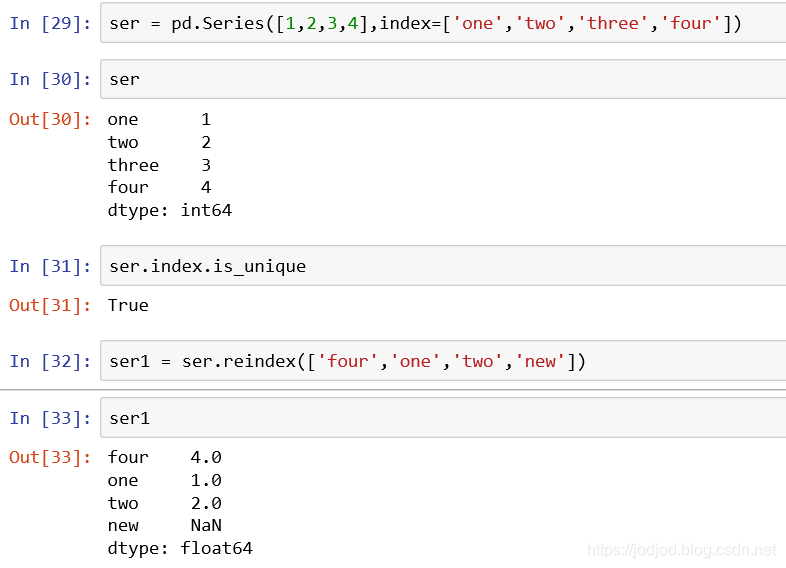 通过series的reindex()方法可以交换原先索引位置,对于未出现过的索引名对应的元素为NaN