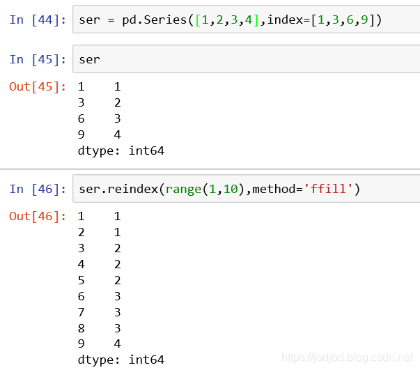 1、method为ffill(forward fill),即向前填充。缺失的索引对应的元素为之前的第一个出现索引的值