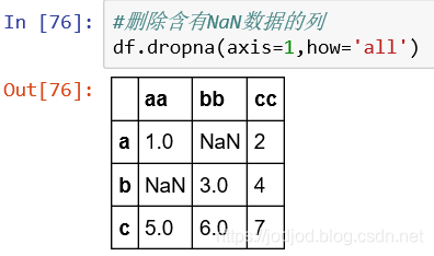 还可以设置删除策略,在dropna()函数中how为'all'是整行或整列全为NaN时才会删除。默认为'any'