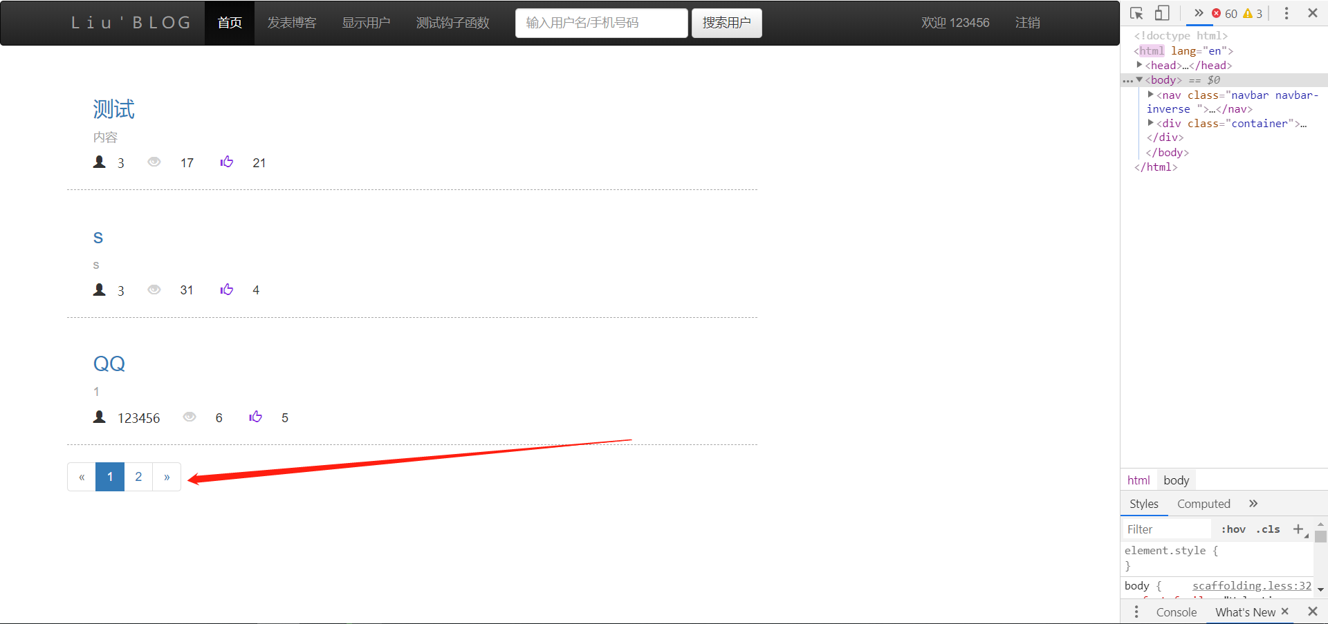 def index():#获取页数page = request.args.get('page',1)paginate = Article.query.paginate(page=int(page),per_page=3)# articles = Article.query.all()# uname = request.cookies.get('uname')# print(uname)uname = session.get('uname')return render_template('index.html', paginate=paginate, uname=uname)