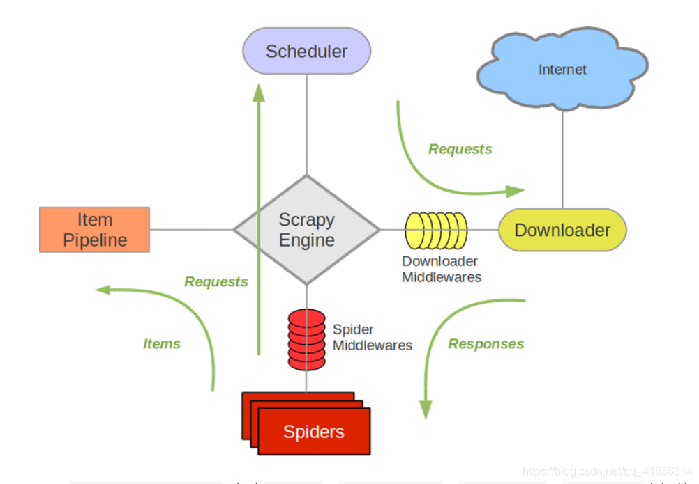 -  Scrapy Engine(引擎): 负责Spider、ItemPipeline、Downloader、Scheduler中间的通讯,信号、数据传递等。