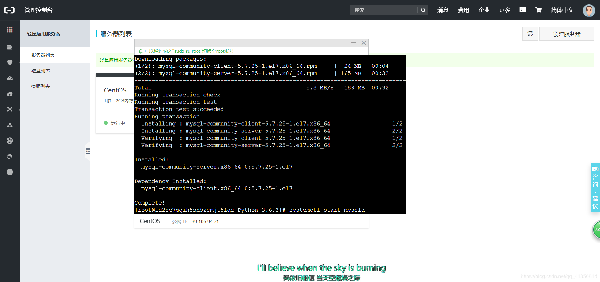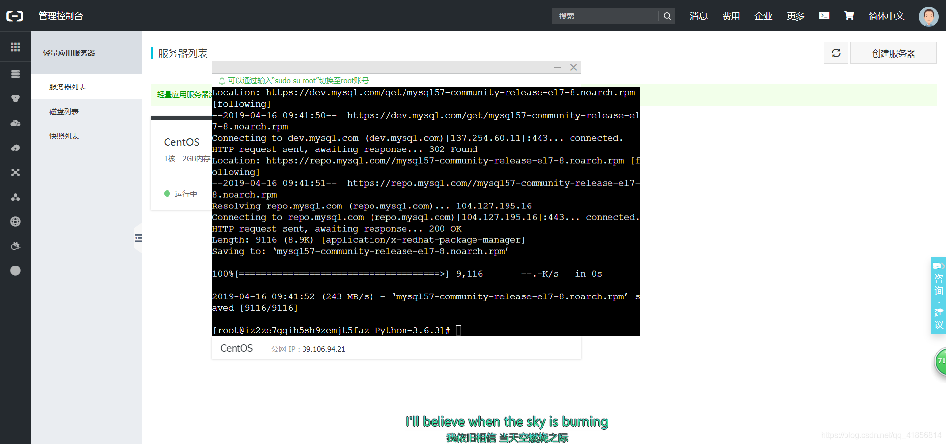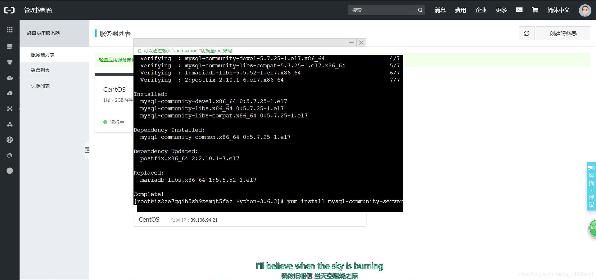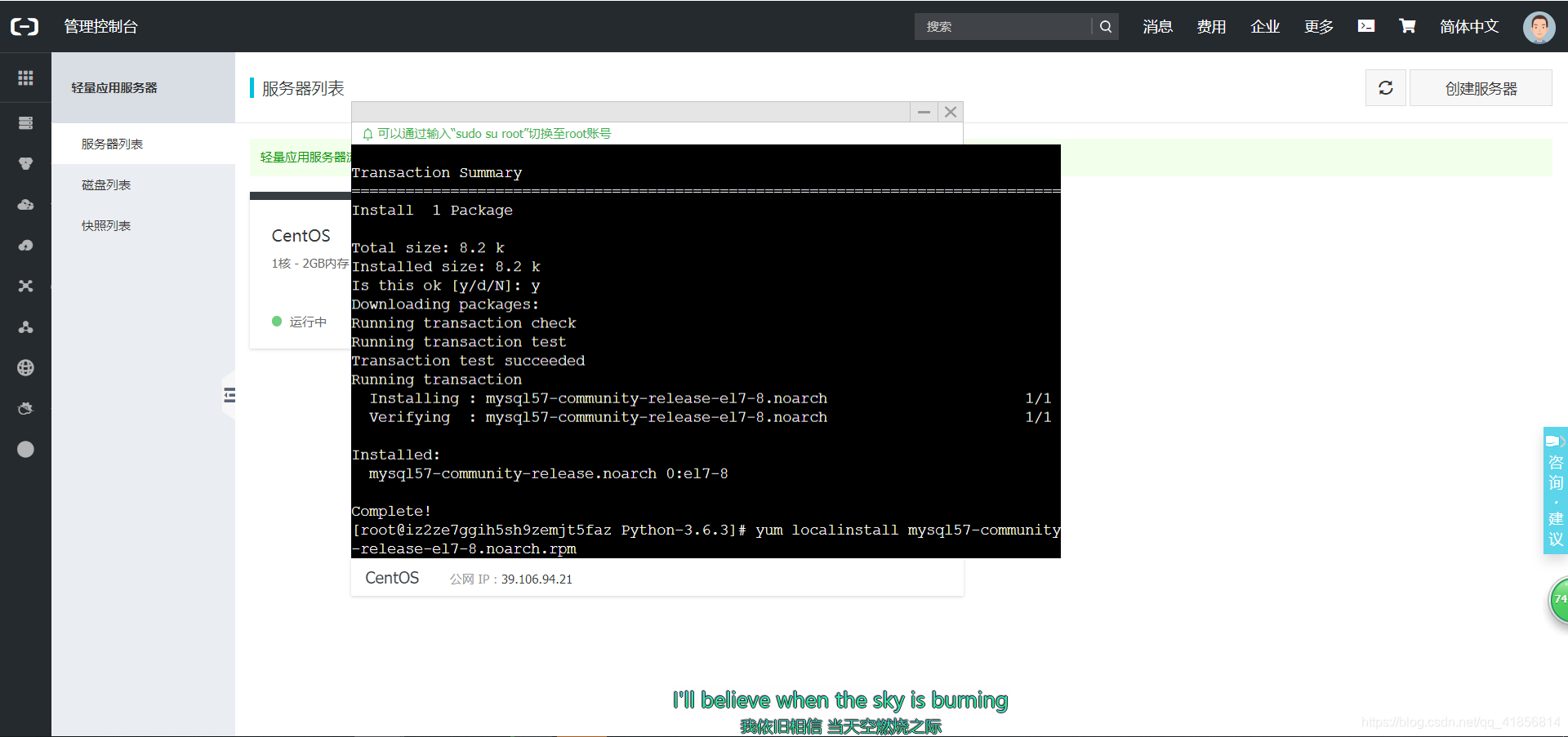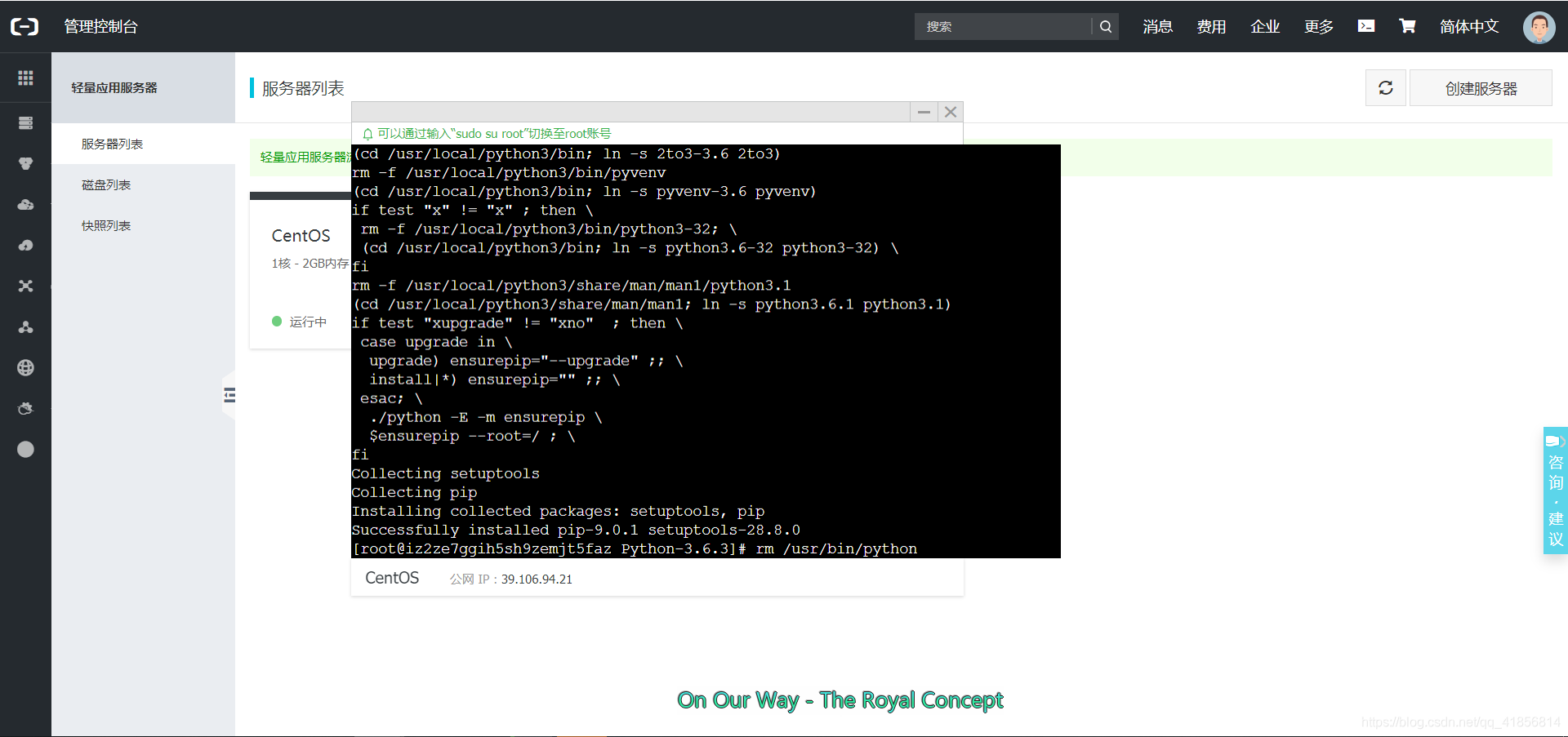 选择好服务器并付费之后,点击阿里云的控制台-云计算基础服务-轻量应用服务器: