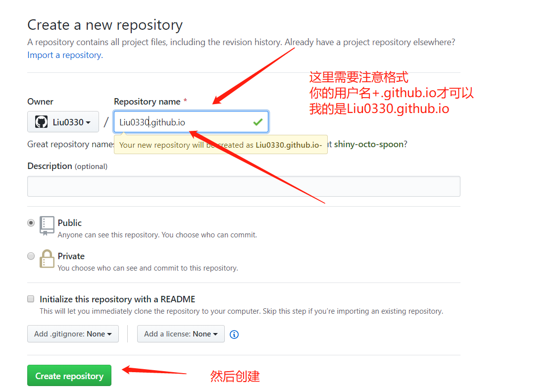 注意此仓库的名称格式是: 你的github用户名.github.io (其中用户名不区分大小写) 如下图