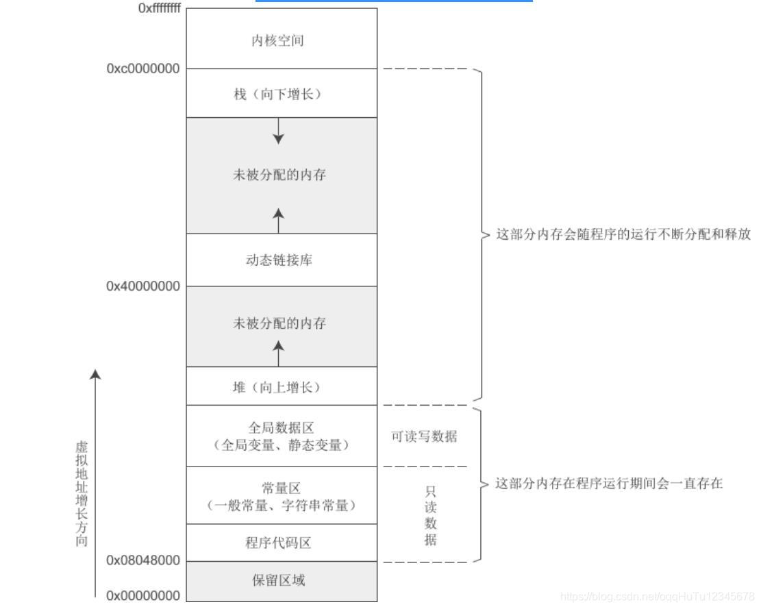 其中栈区、堆区又合称“动态存储区”,而全局区、文字常量区、程序代码区合称“静态存储区”。动态存储区在程序执行过程中动态分配,大小随之动态变化;静态存储区的大小在程序编译连接阶段就已经确定。