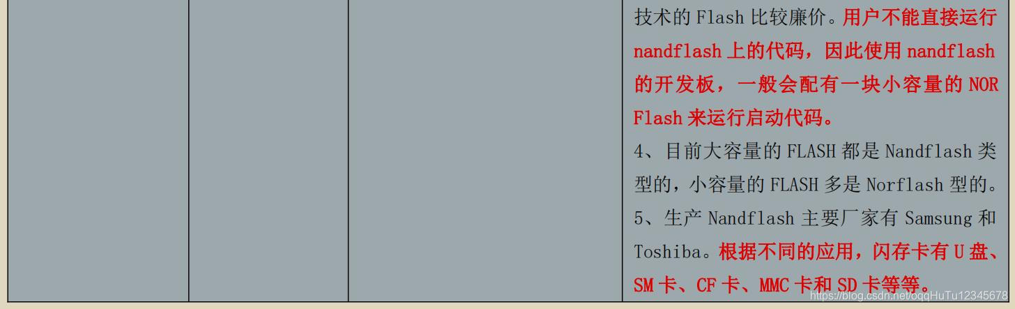 3、NADN FLASH和NOR FLASH的关系与区别如上。至于NAND FLASH和iNand的关系,可以这样理解,iNand、SD卡、MMC卡等等,都是以NAND FLASH为原料,遵循一些协议,添加封装以及接口而制作出来的产品,因此使用起来就带有NAND FLASH的特性,隶属NAND FLASH类别。那有没有利用NOR FLASH制造出来的常用的产品呢?因为容量小,好像日常生活中没有看到,它一般用于开发板作为启动介质,因为代码程序可以直接在NOR FLASH运行。