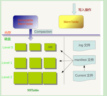 延伸:在leveldb中只有两个memtable:memtable和immutable memtable;但是在rocksdb中,memtable的数量是可以配置的,当memtable中的数据量超过设定值后,默认是64MB,就会转变为一个immutable memtable,后台线程就会将immutable memtable通过pipe形式,以异步批量的方式flush到level0层中新建的sst文件,如果该新建的sst文件与level 0层其他sst文件中的key的范围有重叠的就会留在level 0层中,否则就会向上推到level 1最高推到level 2层中。