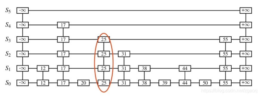 对于25以后的元素其实并不会影响,因为节点之后后向指针,会影响的是指向25的这些节点,在这个例子当中是17这个节点。由于25被删除,17的指针需要穿过25的位置继续往后,指向后面的元素,也就是55和31