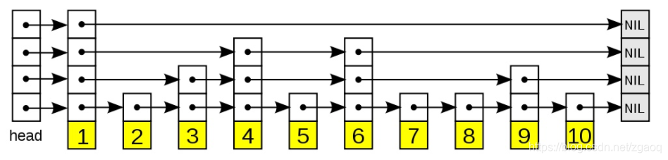 SkipList的本质是List,也就是链表。我们都知道,链表是线性结构的,每次只能移动一个节点,这也是为什么链表获取元素和删除元素的复杂度都是O(n)