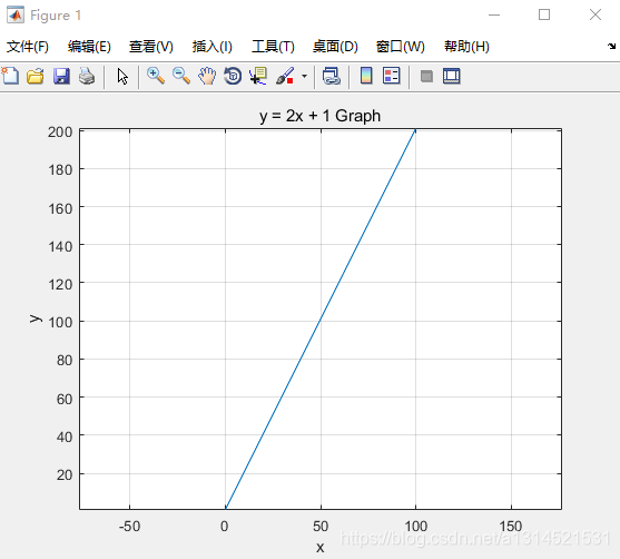 如:x = [0 : 0.5 : 100]; y = 2 * x + 1; plot(x, y), xlabel('x'), ylabel('y'), title('y = 2x + 1 Graph'), grid on, axis equal, axis([1 100 1 210]);