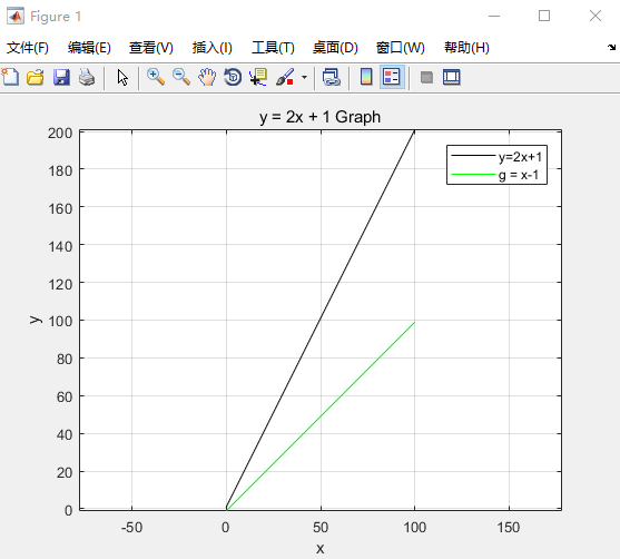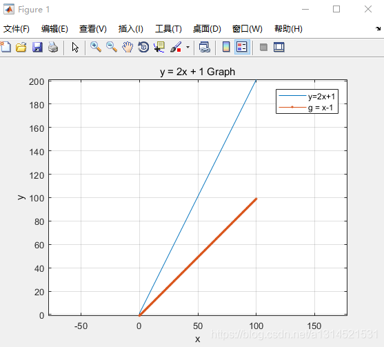 如:x = [0 : 0.5 : 100]; y = 2 * x + 1; g = x - 1; plot(x, y, x, g), xlabel('x'), ylabel('y'), title('y = 2x + 1 Graph'), grid on, axis equal, legend('y=2x+1', 'g = x-1');