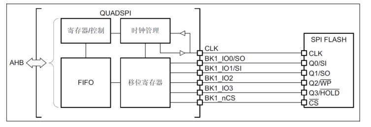 QSPI通过6根线与SPI芯片通信,下图是内部框图: