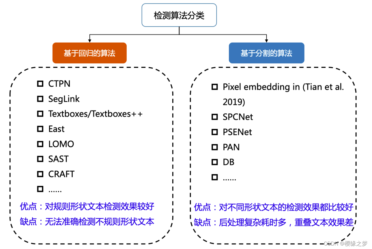 目前较为流行的文本检测算法可以大致分为基于回归和基于分割的两大类文本检测算法,也有一些算法将二者相结合。基于回归的算法借鉴通用物体检测算法,通过设定anchor回归检测框,或者直接做像素回归,这类方法对规则形状文本检测效果较好,但是对不规则形状的文本检测效果会相对差一些,比如CTPN对水平文本的检测效果较好,但对倾斜、弯曲文本的检测效果较差,SegLink对长文本比较好,但对分布稀疏的文本效果较差;基于分割的算法引入了Mask-RCNN,这类算法在各种场景、对各种形状文本的检测效果都可以达到一个更高的水平,但缺点就是后处理一般会比较复杂,因此常常存在速度问题,并且无法解决重叠文本的检测问题。