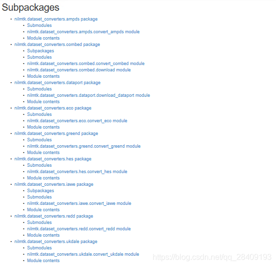 配置了NILMTK包的环境之后,想找数据测试一下,在NILMTK官网的API Docs里边发现dataset_converters模块中有内置的数据集处理函数,如图: