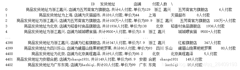 ('商品发货地为'+df['new_发货地址']+',店铺为'+df['店铺']+',共计'+df['付款人数']+',单价为'+df['价格']).to_frame().rename(columns={0:'ID'})#apply函数