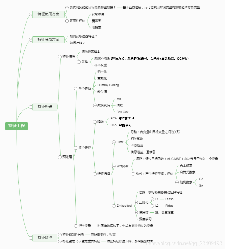 对于机器学习问题,数据和特征往往决定了结果的上限,而算法,模型的选择及优化则是在逐步接近这个上限。特征工程的框架图: