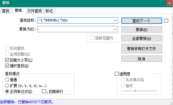 3、^(.*)KERNEL(.*)$\n 加上\n就是把去除的行删除,不加就算把删除的行替换为空格
