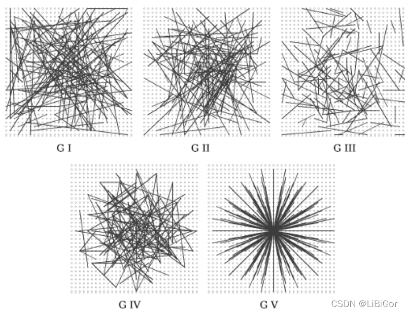 选取点对:以特征点为中心,取S*S的邻域窗口,在窗口内随机选取N组点对,一般N=128,256,512,默认是256,关于如何选取随机点对,提供了五种形式,结果如下图所示: