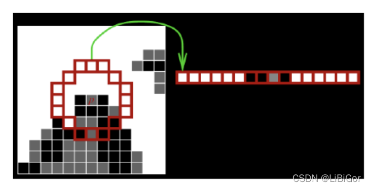 对每一个点对都进行上述的二进制赋值,形成BRIEF的关键点的描述特征向量,该向量一般为 128-512 位的字符串,其中仅包含 1 和 0,如下图所示: