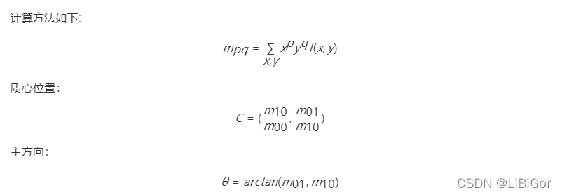 计算特征点的主方向,计算以特征点为圆心半径为r的圆形邻域内的灰度质心位置,将从特征点位置到质心位置的方向做特征点的主方向。
