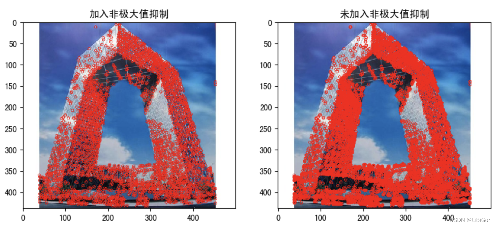在筛选出来的候选角点中有很多是紧挨在一起的,需要通过非极大值抑制来消除这种影响。