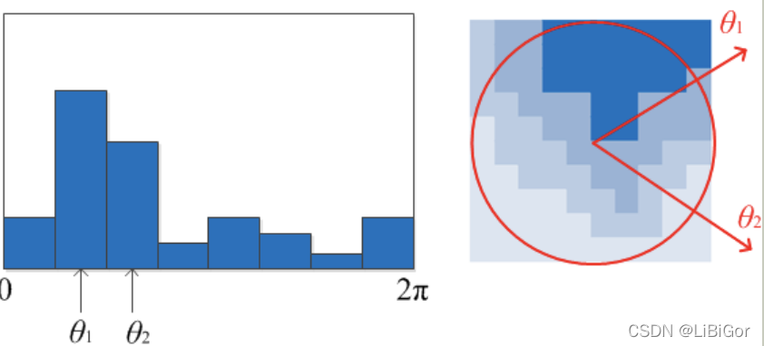 经过上述两个步骤,图像的关键点就完全找到了,这些关键点具有尺度不变性。为了实现旋转不变性,还需要为每个关键点分配一个方向角度,也就是根据检测到的关键点所在高斯尺度图像的邻域结构中求得一个方向基准。